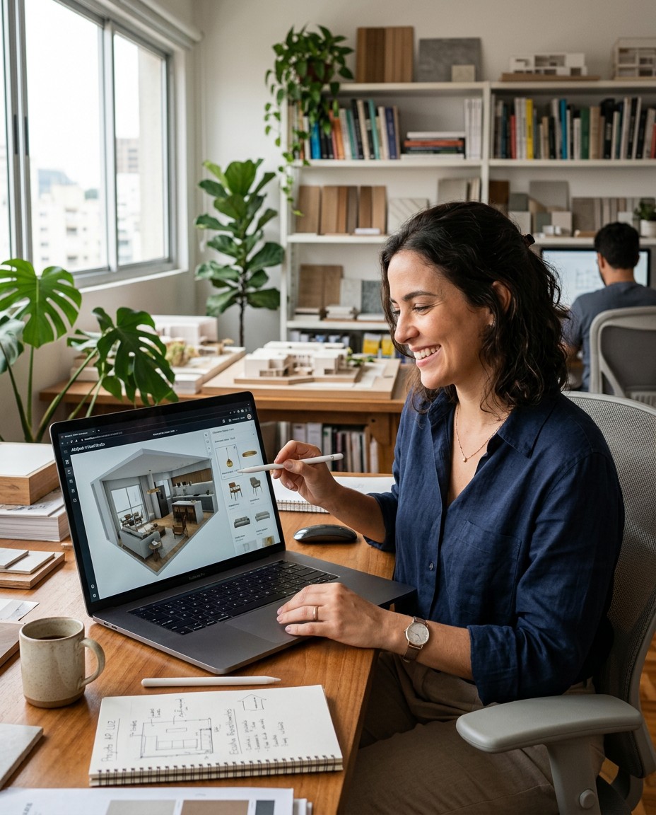 Quando o arquiteto monta o projeto 3D, ele não está apenas criando uma visualização — está definindo uma lista de compras de R$ 50 mil em média. Cada produto inserido no projeto se torna uma recomendação técnica.